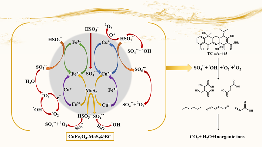 该研究以我国水体中典型抗生素污染物四环素为处理对象,以开发更高效稳定、可循环利用的高级氧化工艺的活化剂为目的,首次将纳米级的多金属复合材料CuFe2O4和MoS2负载于具有多孔结构的松果壳生物炭材料表面,实现了三者的有效结合以及对过一硫酸盐高效稳定的协同活化效果。在最佳条件下,CuFe2O4-MoS2@BC活化过一硫酸盐可在60 min内对50 mg/L四环素实现93.91%的去除率。通过对复合材料的表征和对活性物种、降解产物的鉴定,深入揭示了CuFe2O4-MoS2@BC/PMS/TC体系中的活化机制以及对四环素的降解转化路径。CuFe2O4-MoS2@BC复合催化剂弥补了传统过渡金属和单一碳材料的不足,在提高过硫酸盐利用率的同时,有效缓解了反应过程中催化剂团聚的问题,并在最大程度上降低了金属离子浸出引起二次污染等潜在风险。该研究为设计应用于催化氧化领域的高性能多相催化剂提供了新的思路,并在机理探究方面提供了新的见解。