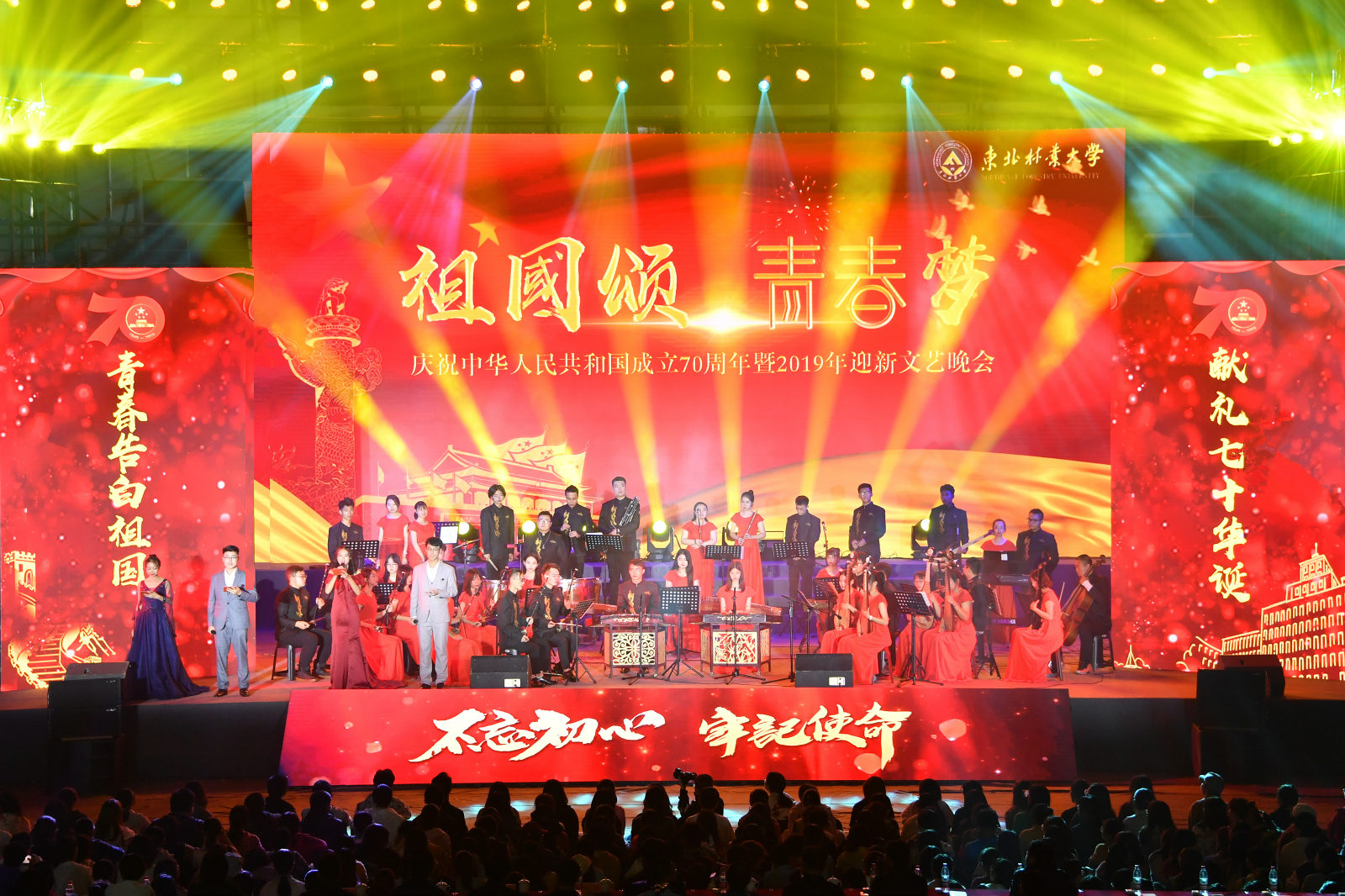 赞歌颂祖国,青春伴理想。为热烈庆祝新中国成立七十周年,深入开展“不忘初心,牢记使命”主题教育,9月28日晚,“祖国颂、青春梦”东北林业大学庆祝中华人民共和国成立70周年暨2019年迎新文艺晚会在新体育馆隆重举行。 学校党委书记张志坤,校长李斌,党委副书记陈文慧,党委副书记、纪委书记王玉琦,副校长孙猛,副校长刘守新,校长助理宋文龙,校长助理李凤日,党委各部门、有关职能部门负责同志,各学院党政负责同志和党委...