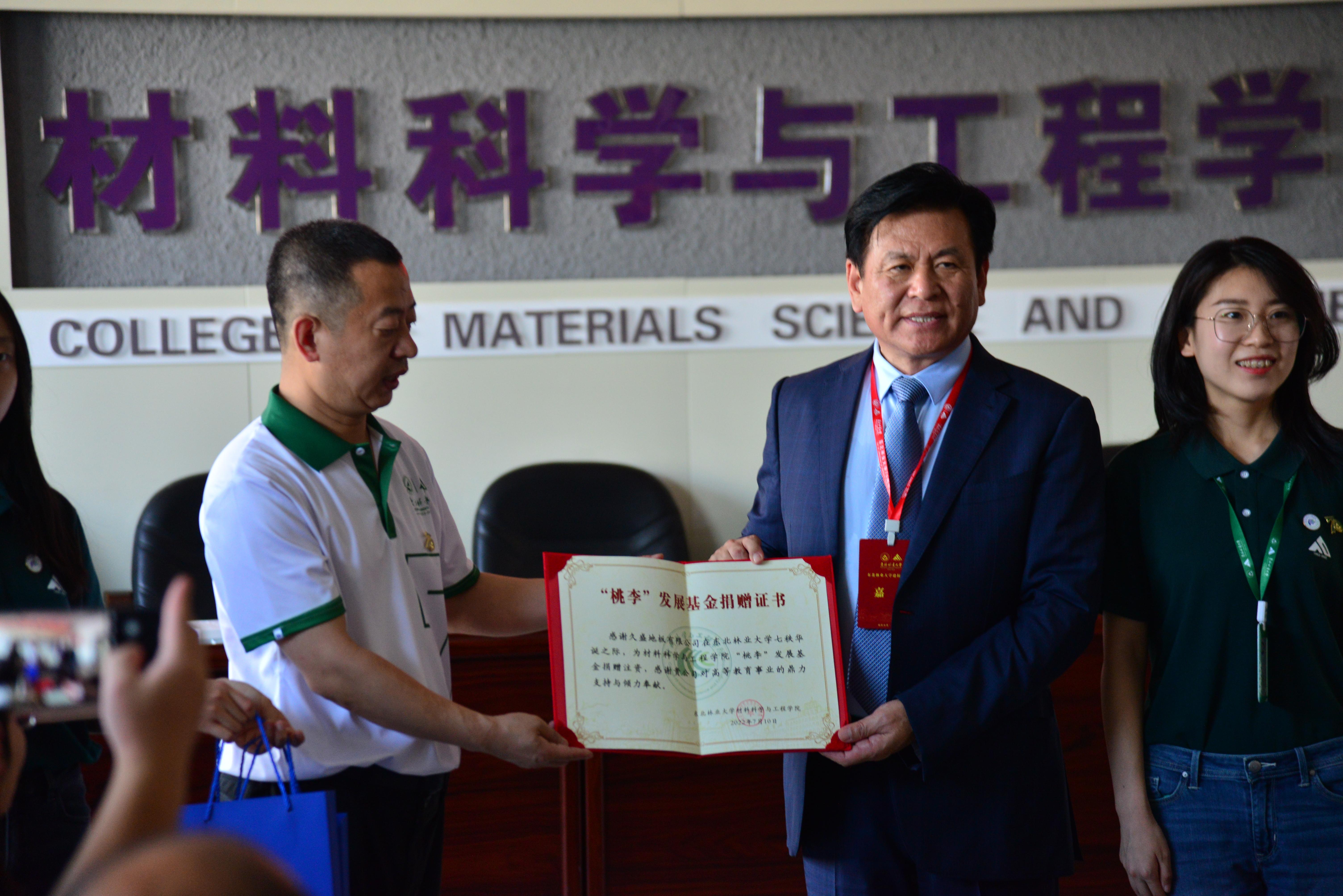 7月10日上午,久盛地板有限公司支持东北林业大学“桃李”发展基金项目捐赠仪式在工程楼604举行。学校党委常委、副校长刘守新,久盛地板有限公司董事会张恩玖主席、孙龙祥先生出席仪式,学校师生代表参加活动。仪式由材料科学与工程学院院长谢延军主持。谢延军致欢迎词。他代表学院,对张恩玖主席百忙之中来参加学校70周年校庆,并向学校“桃李”发展基金项目捐资表示感谢,这是对学校教育事业,对学院学科建设和人才培养的支持...