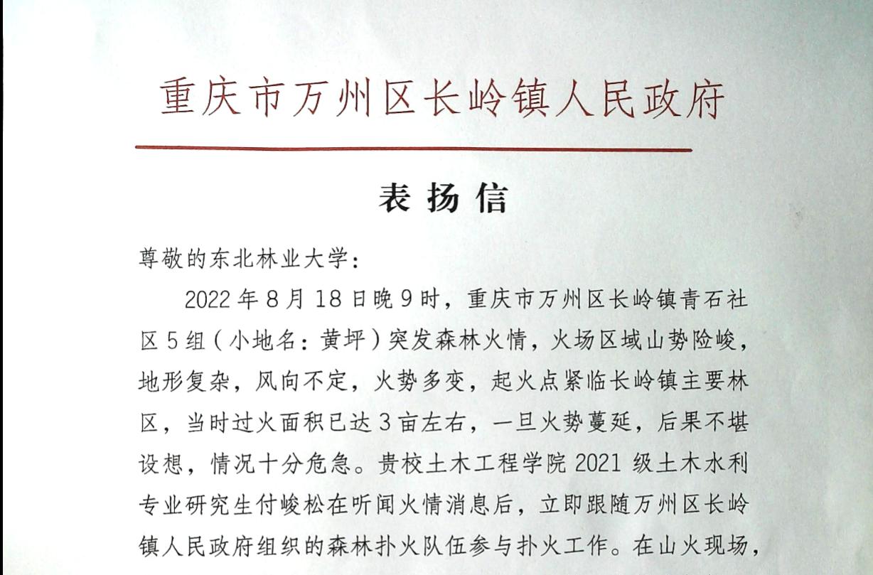 近日,我校土木工程学院收到了重庆市万州区长岭镇人民政府发来的表扬信,表扬我校2021级土木工程学院土木水利专业的付峻松同学在面对森林火灾发生时,不惧危险,主动请缨,与当地干部群众一起奋力扑火,阻止了山火进一步蔓延,保住了长岭镇上万亩林区的安全。据了解,森林火情发生在重庆市万州区长岭镇青石社区5组。当时的重庆万州正遭受六十年不遇的高温,各个乡镇森林火险时有发生。2022年8月18日晚9时,暑期放假的付峻松在回...