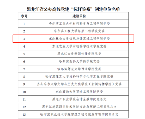 近日,黑龙江省委教育工委公布了黑龙江省公办高校党建“示范创建”名单,我校信息与计算机工程学院党委获评黑龙江省公办高校党建“标杆院系”,国际交流学院直属党支部、林学院林木遗传育种学科党支部、材料科学与工程学院林产化工教工党支部获评黑龙江省公办高校党建“样板支部”,获评基层党组织数量为全省高校首位,并列第一。据悉,本次党建“示范创建”活动由黑龙江省委教育工委主办,各高校党委把关推荐,经资格审查、集...