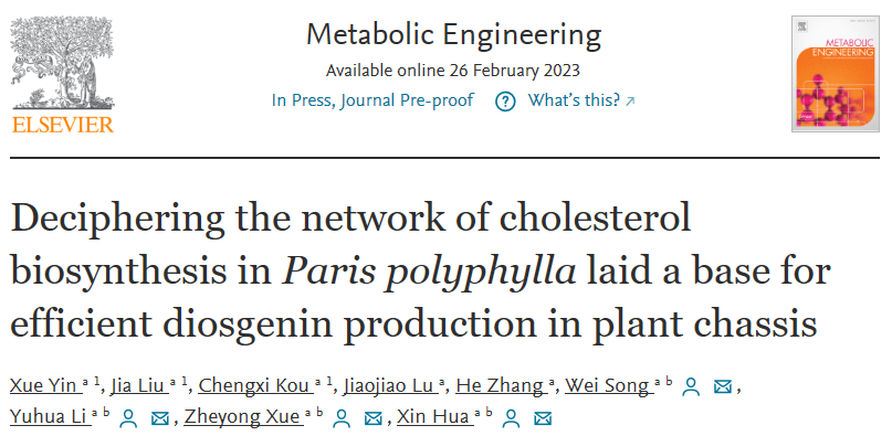 2023年2月26日,我校生命科学学院薛哲勇教授/华欣副教授课题组,在国际合成生物学领域权威刊物《MetabolicEngineering》在线发表了题为“DecipheringthenetworkofcholesterolbiosynthesisinParispolyphyllalaidabaseforefficientdiosgeninproductioninplantchassis”的研究论文。该文章利用根癌农杆菌介导的烟草瞬时表达技术和病毒诱导的基因沉默技术,采用逐步筛选的方法,从药用植物重楼中鉴定出九种酶:SSR1-3、SMO1-3、CPI-...