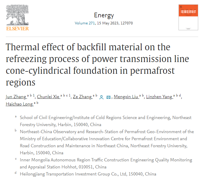 近日,我校土木工程学院张泽教授团队在Elsevier旗下建筑与能源领域知名期刊《Energy》(中科院分区1区Top,影响因子8.857)发表了题为“Thermaleffectofbackfillmaterialontherefreezingprocessofpowertransmissionlinecone-cylindricalfoundationinpermafrostregions”的研究文章,该文章聚焦多年冻土区输电线基础施工后地基土回冻问题,明确了回填土初始温度的重要性。该研究结果对多年冻土区开挖回填类基础的传热机理研究及...