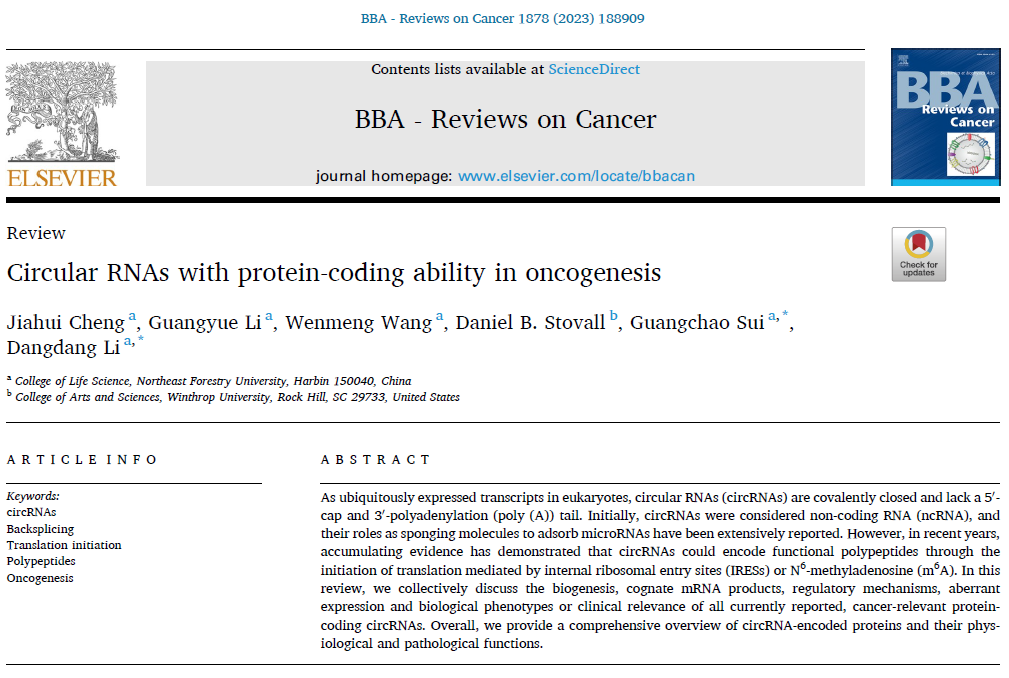 5月10日,我校生命科学学院细胞生物学团队的隋广超教授课题组在国际著名学术期刊《BBA-ReviewsonCancer》(IF:11.414)在线发表了题为“CircularRNAswithProtein-codingAbilityinOncogenesis”的长篇综述文章。环状RNA(circRNA)是一种真核生物中普遍表达的共价封闭转录物,其缺乏5'-cap和3'-(poly(A))尾。因此,circRNA最初被认为是非编码RNA(ncRNA),并且作为海绵分子吸附microRNA的功能已被广泛报道。近年来,越来越多的证据表...