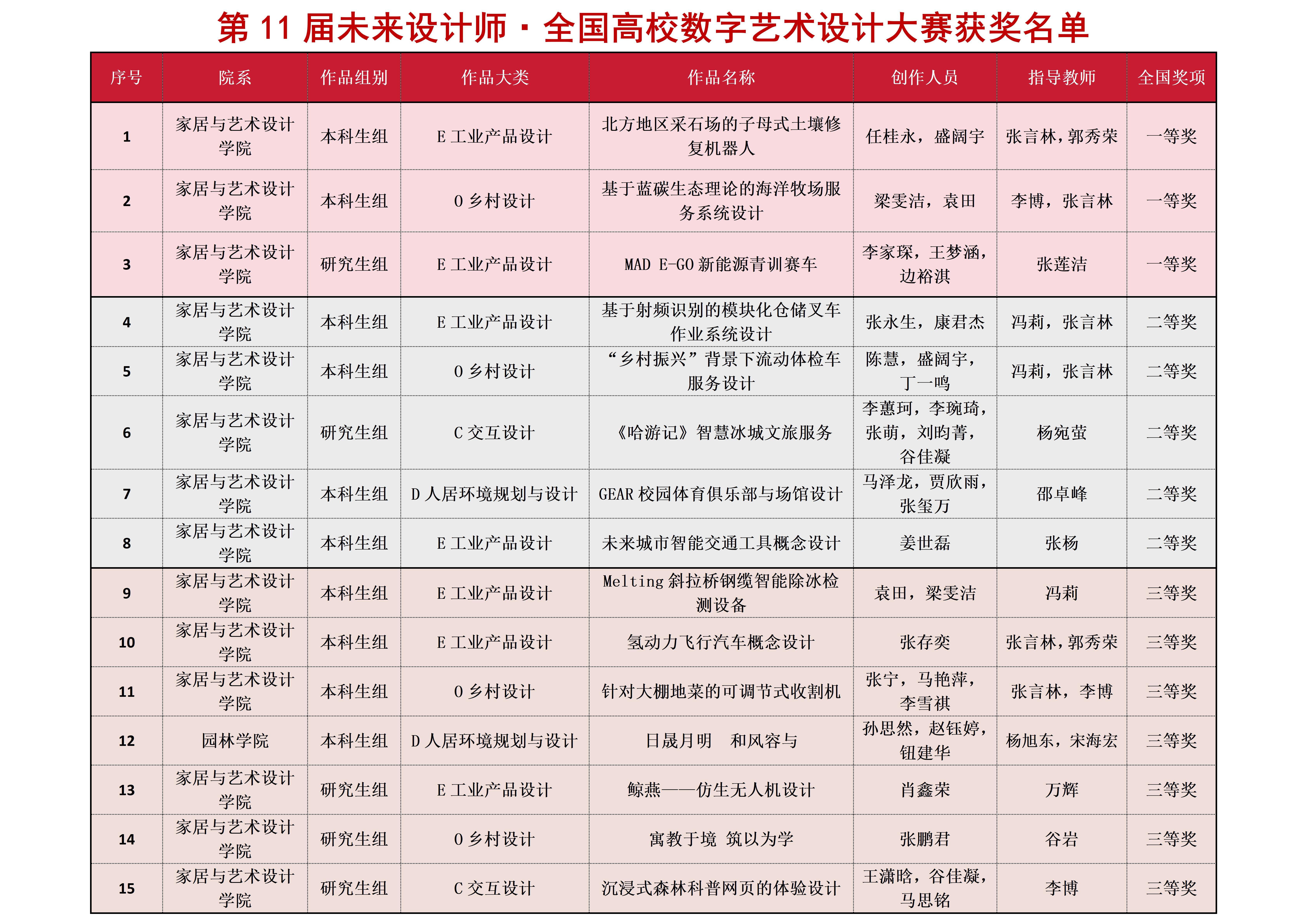 近日,2023年第11届未来设计师·全国高校数字艺术设计大赛公布评审结果,我校家居与艺术设计学院和园林学院学子共获得全国一等奖3项、二等奖5项、三等奖7项,省级奖项131项,多位指导老师获得“优秀指导教师”奖。同时,我校家居与艺术设计学院作为黑龙江赛区的承办单位,在全国29个承办高校中脱颖而出,获得杰出贡献奖。我校已连续三年参加该赛事。大赛期间,家居与艺术设计学院、园林学院、文法学院积极组织开展相关培训、校内...