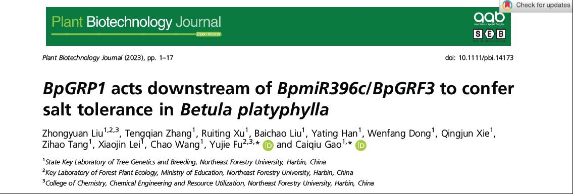 近日,我校林木遗传育种全国重点实验室高彩球教授团队和森林植物生态学教育部重点实验室付玉杰教授研究团队在国际植物学权威期刊PlantBiotechnologyJournal(中科院大类一区,IF=13.2)上发表了题为“BpGRP1actsdownstreamofBpmiR396c/BpGRF3toconfersalttoleranceinBetulaplatyphylla”的研究论文。该研究解析白桦BpmiR396c/BpGRF3/BpGRP1响应盐胁迫的多层级调控机制同时,创制出多个耐盐能力增强的白桦新种质,为后续有效利用...