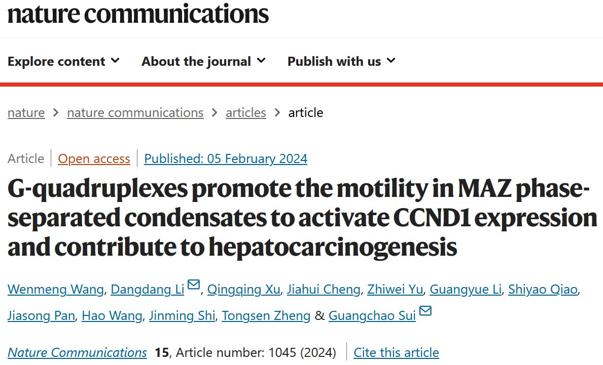 近期,我校生命科学学院隋广超教授团队在国际著名学术期刊NatureCommunications(一区TOP,IF:16.6)发表了题为“G-quadruplexespromotethemotilityinMAZphase-separatedcondensatestoactivateCCND1expressionandcontributetohepatocarcinogenesis”的研究论文。研究揭示了启动子中G-四链体通过增强MAZ蛋白相分离凝聚体的动态性以激活CCND1表达并促进肝癌进展的新机制。G-四链体(G-quadruplex,G4)是一种非经典的核酸二级结构。...
