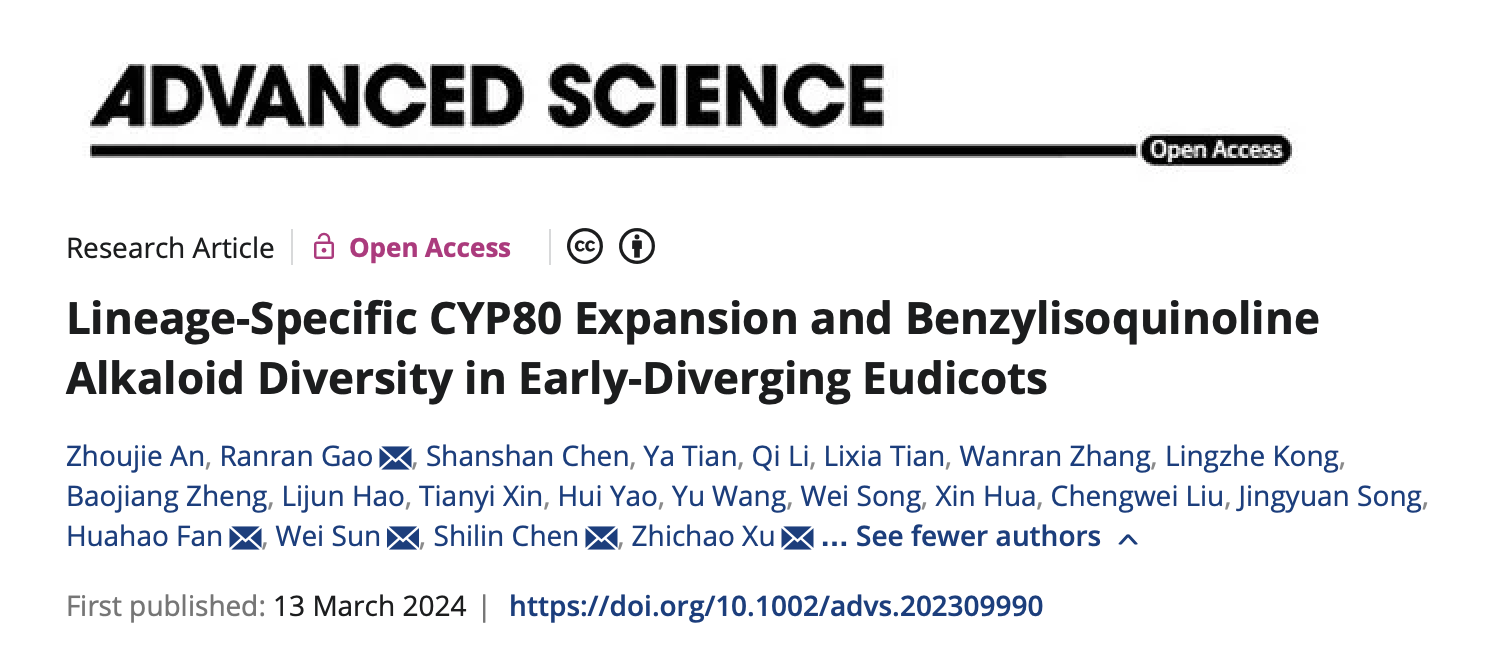 近日,我校生命科学学院徐志超教授团队在国际知名期刊AdvancedScience(中科院一区,IF:15.1)在线发表了题为“基部双子叶植物苄基异喹啉类生物碱结构多样性形成机制”的研究论文。该成果报道了催化青藤碱等苄基异喹啉生物碱(BenzylisoquinolineAlkaloid,BIAs)生物合成骨架形成的新颖酶,发现种系特异的CYP80基因扩张及新功能化驱动了防己科物种苄基异喹啉生物碱结构多样性,为BIAs药用活性物质的绿色合成及药物开发提供支撑...