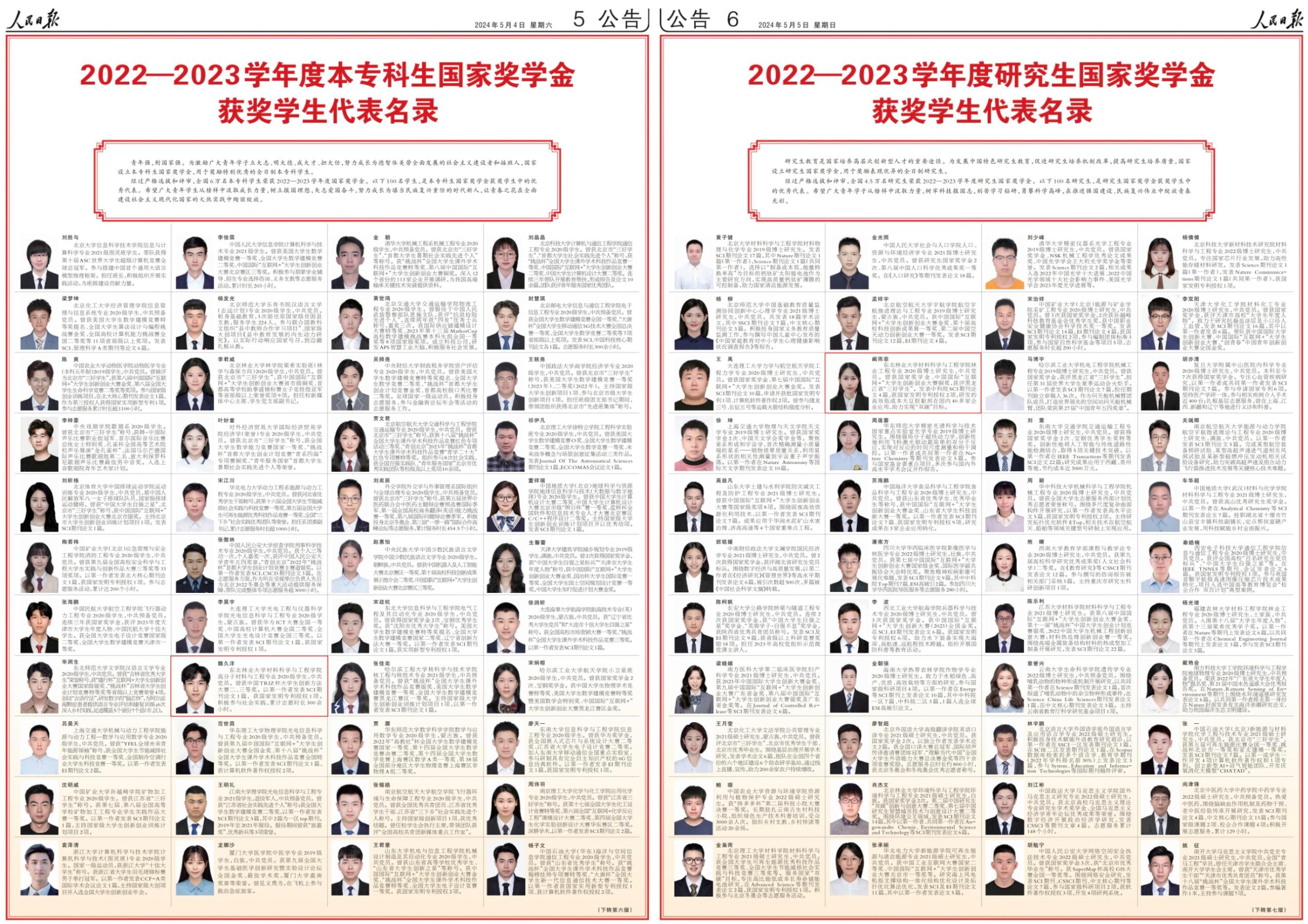 5月4日、5日,人民日报分别刊登了2022—2023学年度本专科生国家奖学金获奖学生代表名录、2022—2023学年度研究生国家奖学金获奖学生代表名录。我校材料科学与工程学院2020级高分子材料与工程专业本科生魏久洋和2020级林业工程专业博士研究生阚雨菲两名同学脱颖而出,光荣上榜。据了解,全国共有6万名本专科学生、4.5万名研究生荣获2022—2023学年度国家奖学金。经过严格选拔和评审,人民日报选出100名本科生、100名研究生优秀代...