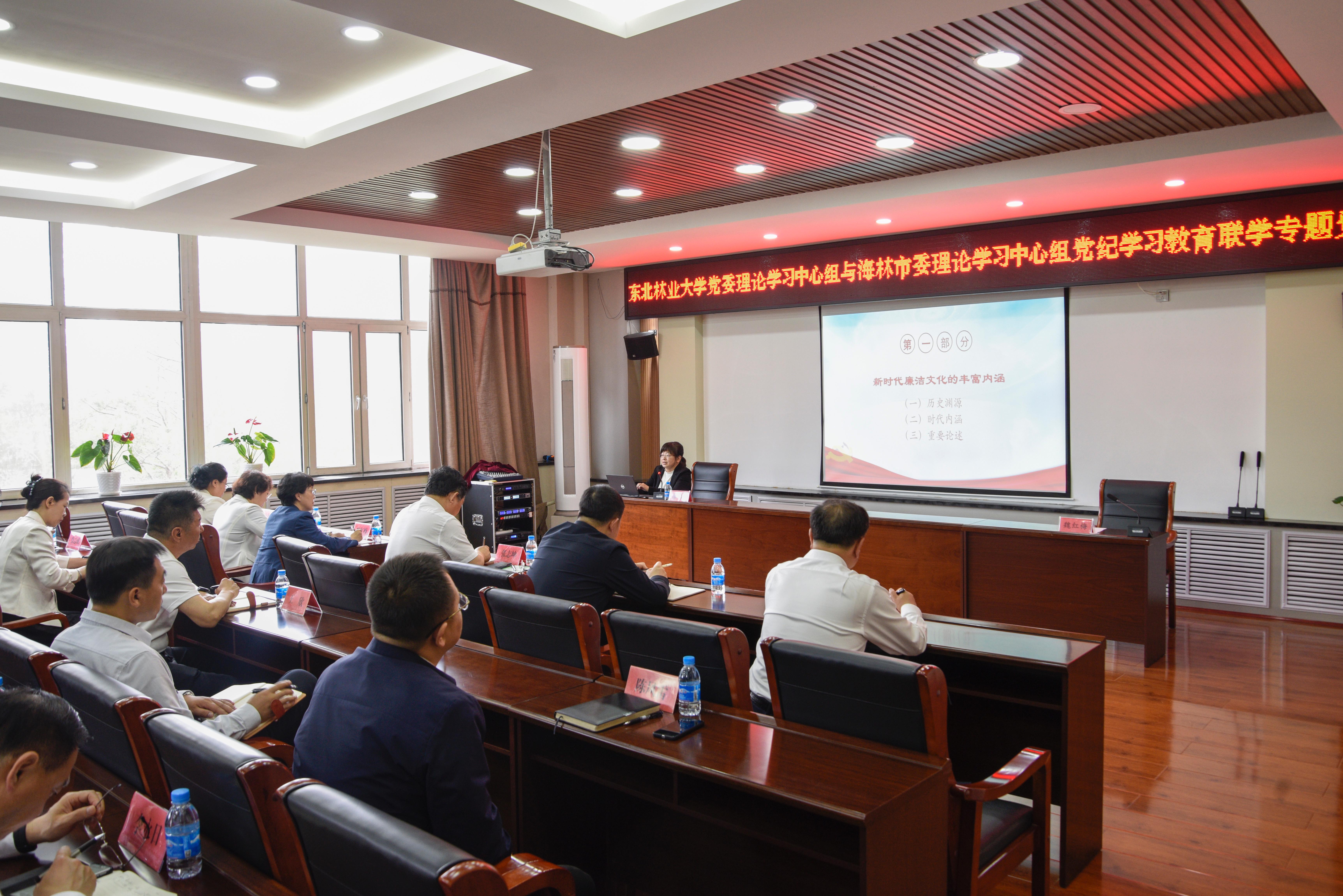 6月14日,学校党委理论学习中心组与海林市委理论学习中心组举行党纪学习教育联学。牡丹江市委党校党史党建教研部主任李颖教授讲座《加强新时代廉洁文化建设》专题党课。党委书记张志坤,党委副书记陈文慧,党委常委、副校长孙猛,党委副书记、纪委书记宋吉红,海林市委书记魏红梅,海林市委副书记、市长张洪蓬,海林市人大常委会主任王欣,海林市政协主席赵立群,海林市委副书记付晓东与海林市副市级以上领导、东北林业大学部分...