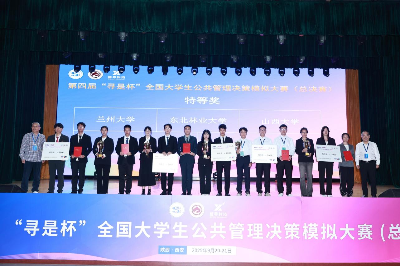 9月19日至21日,第四届“寻是杯”全国大学生公共管理决策模拟大赛(总决赛)在西安交通大学兴庆校区举行。由我校文法学院教师王雪梅、张梦时指导,2023级政治学与行政学专业本科生徐济尘、孙桐和张承毅三名同学组成的代表队,在比赛中荣获特等奖,两位指导老师获评优秀指导教师奖。参赛团队与指导教师合影“寻是杯”全国大学生公共管理决策模拟大赛是目前国内公共管理学科领域最具影响力的本科生竞赛活动之一。大赛邀请国内公共...