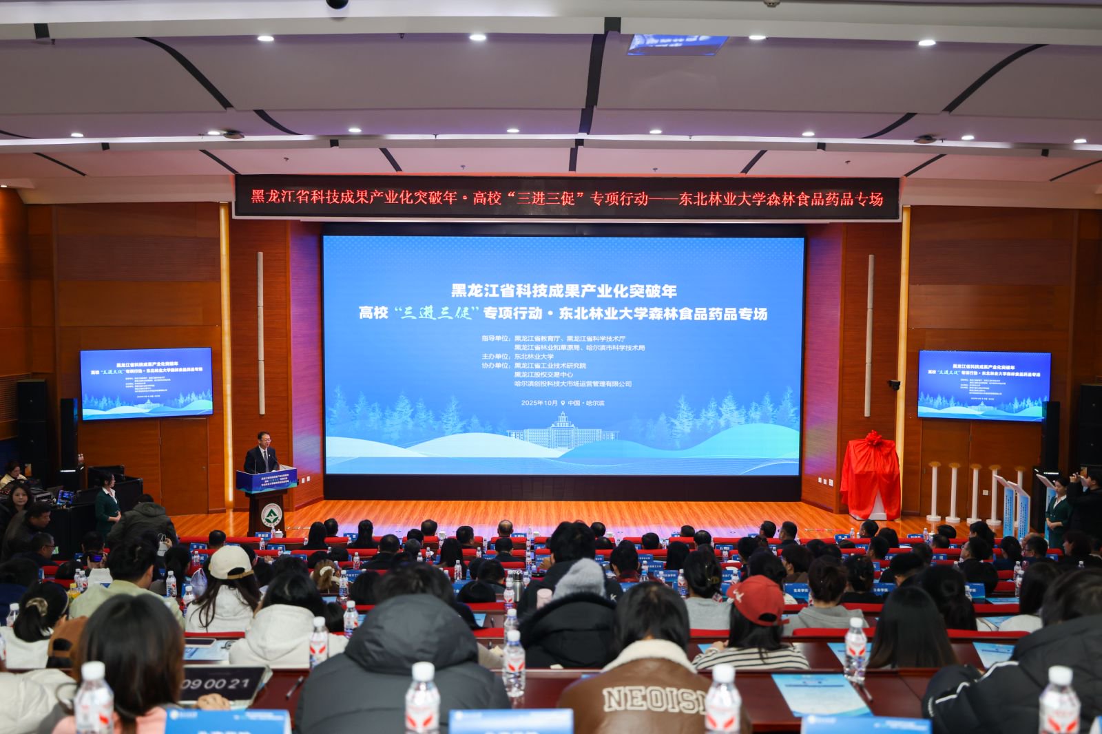 如何让高校的科技成果不再“沉睡”?怎样打通从实验室到生产线的“最后一公里”?10月29日,黑龙江省科技成果产业化突破年·高校“三进三促”专项行动——东北林业大学森林食品药品专场活动,绘出了发展图景。来自龙江的近百家校企地负责人齐聚东林,共同探索科技成果转化新路径,为龙江生物经济发展注入新动能。学校党委常委、副校长李明泽主持专场活动。活动现场活动现场,学校党委书记孙猛与省科技厅二级巡视员王喜林共同为“...