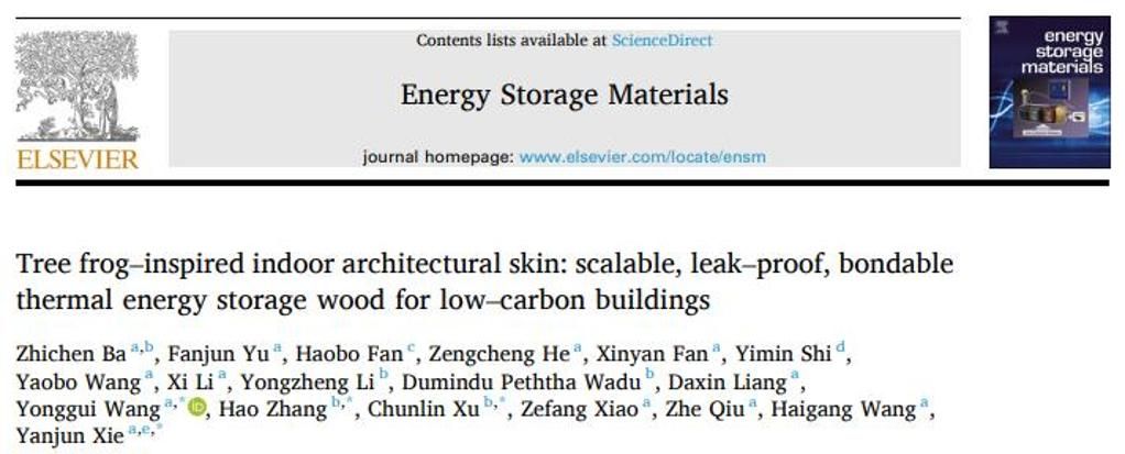近日,我校生物质材料科学与技术教育部重点实验室/木质新型材料教育部工程研究中心谢延军教授和王永贵教授团队联合芬兰奥博学术大学徐春林教授和张昊博士后团队在国际能源材料顶级期刊《Energy Storage Materials》(IF=20.2)上发表了题为“Tree Frog-Inspired Indoor Architectural Skin: Scalable, Leak-Proof, Bondable Thermal Energy Storage Wood for Low-...