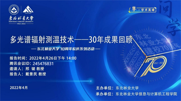为迎接建校70周年华诞,学校组织东北林业大学70周年校庆系列学术报告活动,旨在总结学术成就,活跃学术氛围,彰显学者风采,激发创新热情,奏响学术强校最强音。报告题目:多光谱辐射测温技术——30年成果回顾报告时间:2022年4月26日下午14:00腾讯会议ID:245476831邀请人:邢键教授报告人:戴景民教授报告摘要:多光谱测温技术是上个世纪90年代初兴起的辐射测温技术,即通过多个波段(光谱)的辐射测量,再通过解算算法同时求...