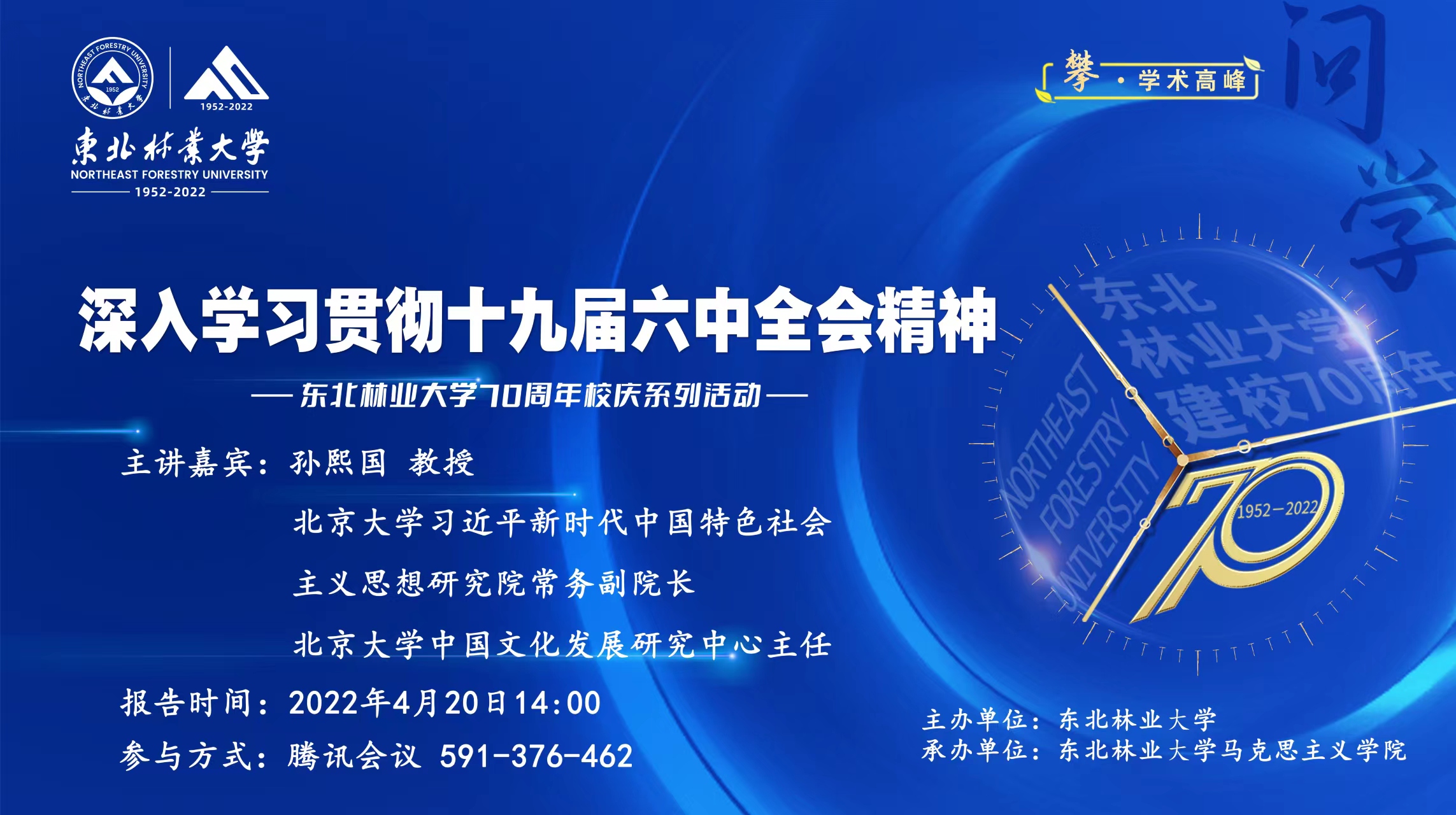 为迎接建校70周年华诞,学校组织“攀·学术高峰”系列学术活动,旨在总结学术成就,活跃学术氛围,彰显学者风采,激发创新热情,奏响学术强校最强音。报告题目:深入学习贯彻十九届六中全会精神报告时间:2022年4月20日14:00报告地点:腾讯会议591-376-462报告人:孙熙国教授个人简介:孙熙国,北京大学马克思主义学院教授、博士生导师,北京大学习近平新时代中国特色社会主义思想研究院常务副院长,北京市马克思主义理论大众化...