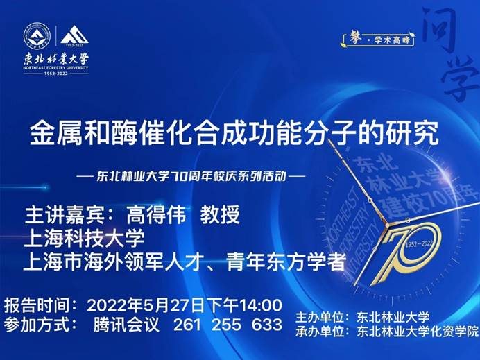 为迎接建校70周年华诞,学校组织“攀·学术高峰”系列学术活动,旨在总结学术成就,活跃学术氛围,彰显学者风采,激发创新热情,奏响学术强校最强音。报告题目:金属和酶催化合成功能分子的研究报告时间:2022年5月27日下午14:00报告地点:腾讯会议261-255-633报 告 人:高得伟教授个人简介:高得伟,上海科技大学物质科学与技术学院,教授,博士生导师。2011年本科毕业于东北林业大学化学工程与工艺专业,2016年毕业于中国科学...