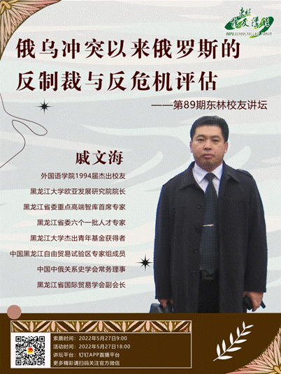 为迎接建校70周年华诞,学校诚邀海内外东林校友做客《东林校友讲坛》,一起拾忆青春年华,共筑东林梦想!活动主题:拓宽国际视野助力未来开拓发展主讲嘉宾:戚文海黑龙江大学欧亚发展研究院院长活动时间: 2022年5月27日18:00活动地点:钉钉平台索票时间:2022年5月27日9:00参与方式关注“东林团委”官方微信平台(nefutw)进行抢票,凭“抢票成功”凭证方可入场,或加入钉钉群参与活动。嘉宾简介:戚文海,东北林业大学外国语学院1...