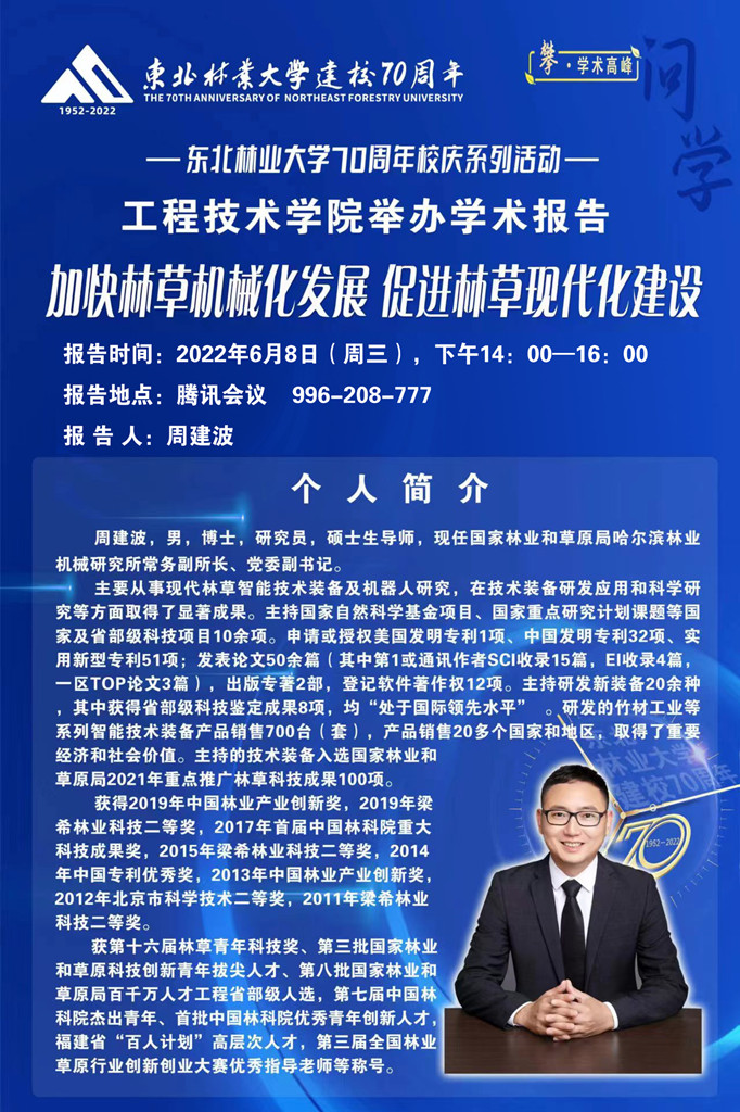 为迎接建校70周年华诞,学校组织“攀·学术高峰”系列学术活动,旨在总结学术成就,活跃学术氛围,彰显学者风采,激发创新热情,奏响学术强校最强音。报告题目:加快林草机械化发展 促进林草现代化建设报告时间:2022年6月8日(周三),下午14:00—16:00报告地点:腾讯会议,996208777报 告 人:周建波 周建波,男,博士,研究员,硕士生导师,现任国家林业和草原局哈尔滨林业机械研究所常务副所长、党委副书记。主要从事现代...