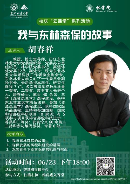 为喜迎我校建校70周年华诞,传承东林使命,赓续林学精神,林学院特开展喜迎建校70周年校庆“云课堂”系列活动。旨在为校友们搭起与母校联络感情的桥梁,重温曾经在校的温暖时光,追忆当年的青春岁月,师生共同述往思来、共谱芳华。同时,启迪在校师生以昂扬向上的精神风貌迎接70年校庆,继往开来,再谱新篇。活动主题:我与东林森保的故事活动时间:2022年6月23日下午18:00—19:00活动地点:智慧树直播平台主讲嘉宾:胡春祥教