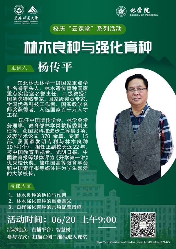 为喜迎我校建校70周年华诞,传承东林使命,赓续林学精神,林学院特开展喜迎建校70周年校庆“云课堂”系列活动。旨在为校友们搭起与母校联络感情的桥梁,重温曾经在校的温暖时光,追忆当年的青春岁月,师生共同述往思来、共谱芳华。同时,启迪在校师生以昂扬向上的精神风貌迎接70年校庆,继往开来,再谱新篇。活动主题:林木良种与强化育种活动时间:2022年6月20日上午9:00—10:00活动地点:智慧树直播平台主讲嘉宾:杨传平教
