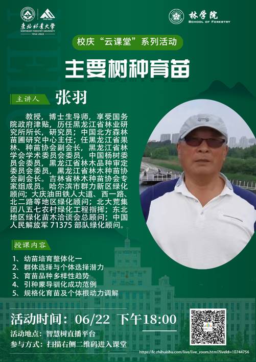 为喜迎我校建校70周年华诞,传承东林使命,赓续林学精神,林学院特开展喜迎建校70周年校庆“云课堂”系列活动。旨在为校友们搭起与母校联络感情的桥梁,重温曾经在校的温暖时光,追忆当年的青春岁月,师生共同述往思来、共谱芳华。同时,启迪在校师生以昂扬向上的精神风貌迎接70年校庆,继往开来,再谱新篇。活动主题:主要树种育苗活动时间:2022年6月22日下午18:00—19:00活动地点:智慧树直播平台主讲嘉宾:张 羽教