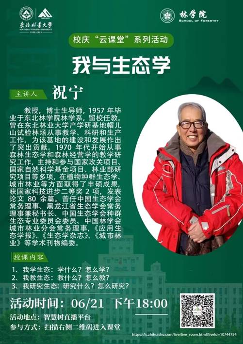 为喜迎我校建校70周年华诞,传承东林使命,赓续林学精神,林学院特开展喜迎建校70周年校庆“云课堂”系列活动。旨在为校友们搭起与母校联络感情的桥梁,重温曾经在校的温暖时光,追忆当年的青春岁月,师生共同述往思来、共谱芳华。同时,启迪在校师生以昂扬向上的精神风貌迎接70年校庆,继往开来,再谱新篇。活动主题:我与生态学活动时间:2022年6月21日下午18:00—19:00活动地点:智慧树直播平台主讲嘉宾:祝 宁教
