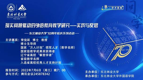 为迎接建校70周年华诞,学校组织“攀·学术高峰”系列学术活动,旨在总结学术成就,活跃学术氛围,彰显学者风采,激发创新热情,奏响学术强校最强音。报告题目:现实问题驱动的外语教育教学研究:实践与反思报告时间:2022年7月6日19:00报告地点:腾讯会议245 878 342报 告 人:常俊跃教授个人简介:常俊跃,博士,教授,博士生导师,国家级教学成果奖获得者,辽宁省高校“攀登学者”,省级教学名师,入选省高校优秀人才支持计...