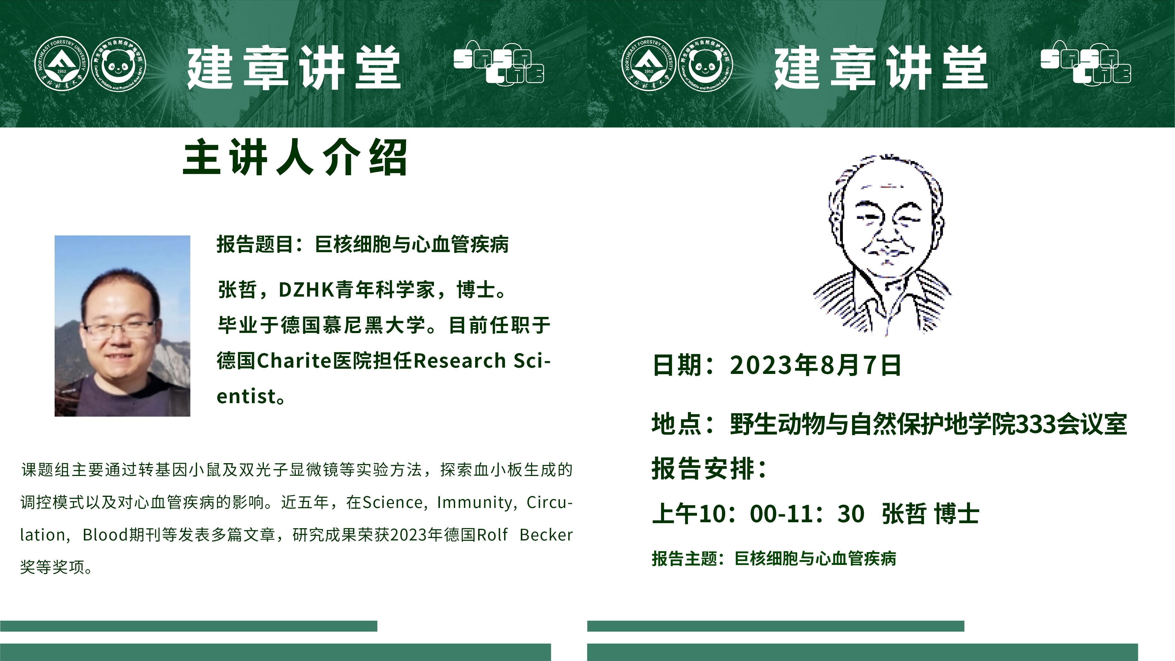 主讲人:张哲博士时间:2023年8月7日,上午10:00-11:30地点:野生动物与自然保护地学院333会议室报告题目:巨核细胞与心血管疾病张哲,博士,DZHK青年科学家,博士毕业于德国慕尼黑大学。目前任职于德国Charite医院担任ResearchScientist。课题组主要通过转基因小鼠及双光子显微镜等实验方法,探索血小板生成的调控模式以及对心血管疾病的影响。近五年,在Science,Immunity, Circulation, Blood期刊等发表多篇文章,研究成果...