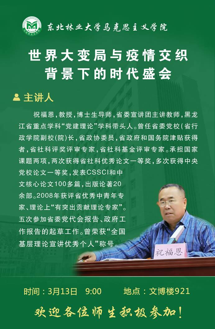 报告题目:2024年全国“两会”精神解析报告人:祝福恩时间:3月13日9:00地点:文博楼921报告人简介:祝福恩,教授,博士生导师,省委宣讲团主讲教师,黑龙江省重点学科“党建理论”学科带头人。曾任省委党校(省行政学院)副校(院)长,省政协委员,省政府和国务院津贴获得者,省社科评奖评审专家,省社科基金评审专家。承担国家课题两项,两次获得省社科优秀论文一等奖,多次获得中央党校论文一等奖,发表CSSCI和中文核心论文100...