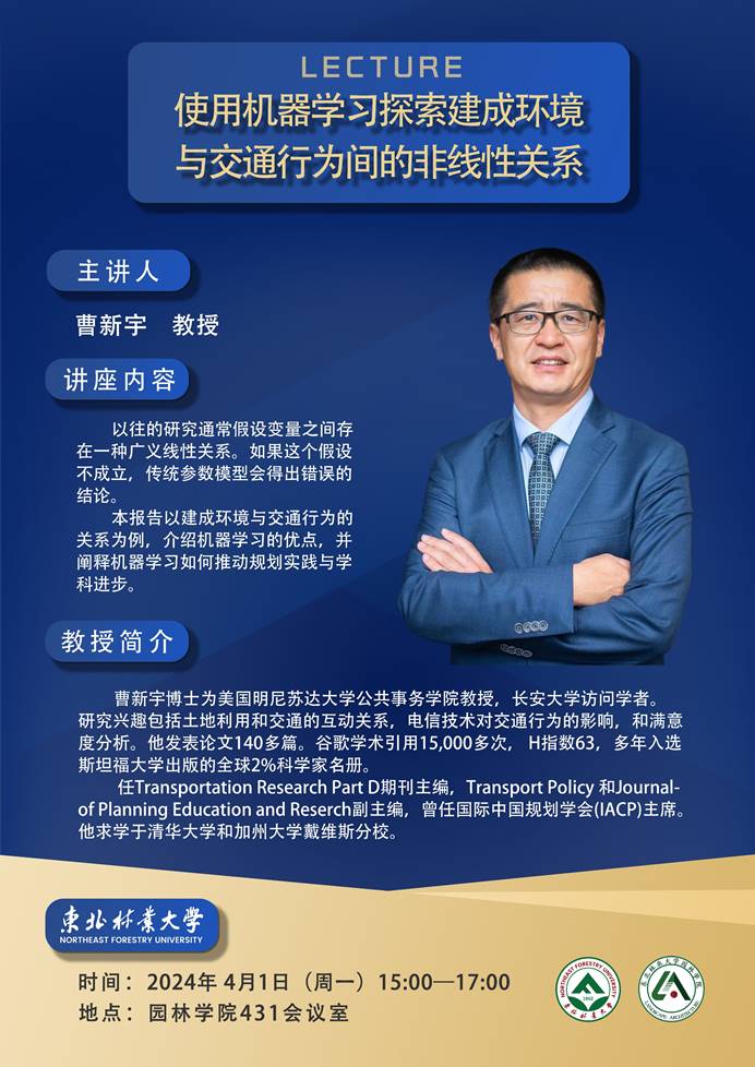报告题目:使用机器学习探索建成环境与交通行为间的非线性关系报告时间:2024年4月1日(周一)15:00-17:00报告地点:园林学院431会议室报告人:曹新宇 教授报告内容:以往的研究通常假设变量之间存在一种广义线性关系。如果这个假设不成立,传统参数模型会得出错误的结论。本报告以建成环境与交通行为的关系为例,介绍机器学习的优点,并阐释机器学习如何推动规划实践与学科进步。报告人简介:曹新宇博士为美国明尼苏达大学公共事...