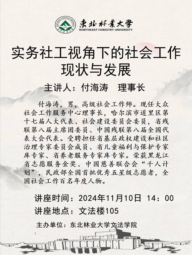 主讲人:付海涛理事长付海涛,男,高级社会工作师。现任大众社会工作服务中心理事长,哈尔滨市道里区第十七届人大代表、社会建设委员会委员,省残联第八届主席团委员、中国残联第八届全国代表大会代表。受聘担任省基层政权建设和社区治理专家委员会成员、省儿童福利与保护专家库专家、省养老服务专家库专家。荣获黑龙江省志愿服务金奖、中国慈善联合会“千人计划”,民政部全国首批优秀五星级志愿者,全国社会工作百名年度人物...