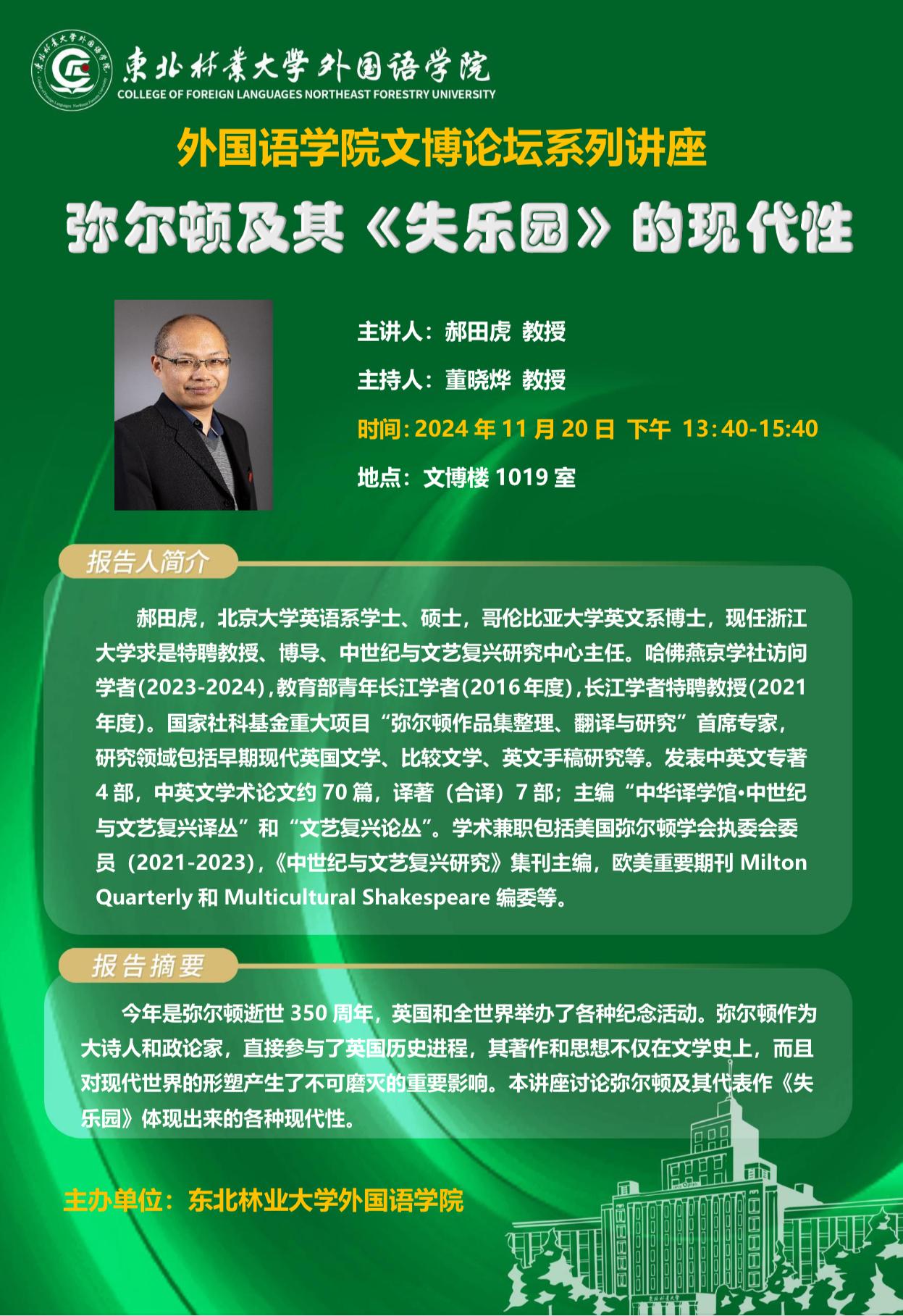 今年是弥尔顿逝世350周年,英国和全世界举办了各种纪念活动。弥尔顿作为大诗人和政论家,直接参与了英国历史进程,其著作和思想不仅在文学史上,而且对现代世界的形塑产生了不可磨灭的重要影响。本讲座讨论弥尔顿及其代表作《失乐园》体现出来的各种现代性。主题:弥尔顿及其《失乐园》的现代性时间:2024年11月20日13:40地点:文博楼1019专家简介:郝田虎,北京大学英语系学士、硕士,哥伦比亚大学英文系博士,现任浙江大学求...