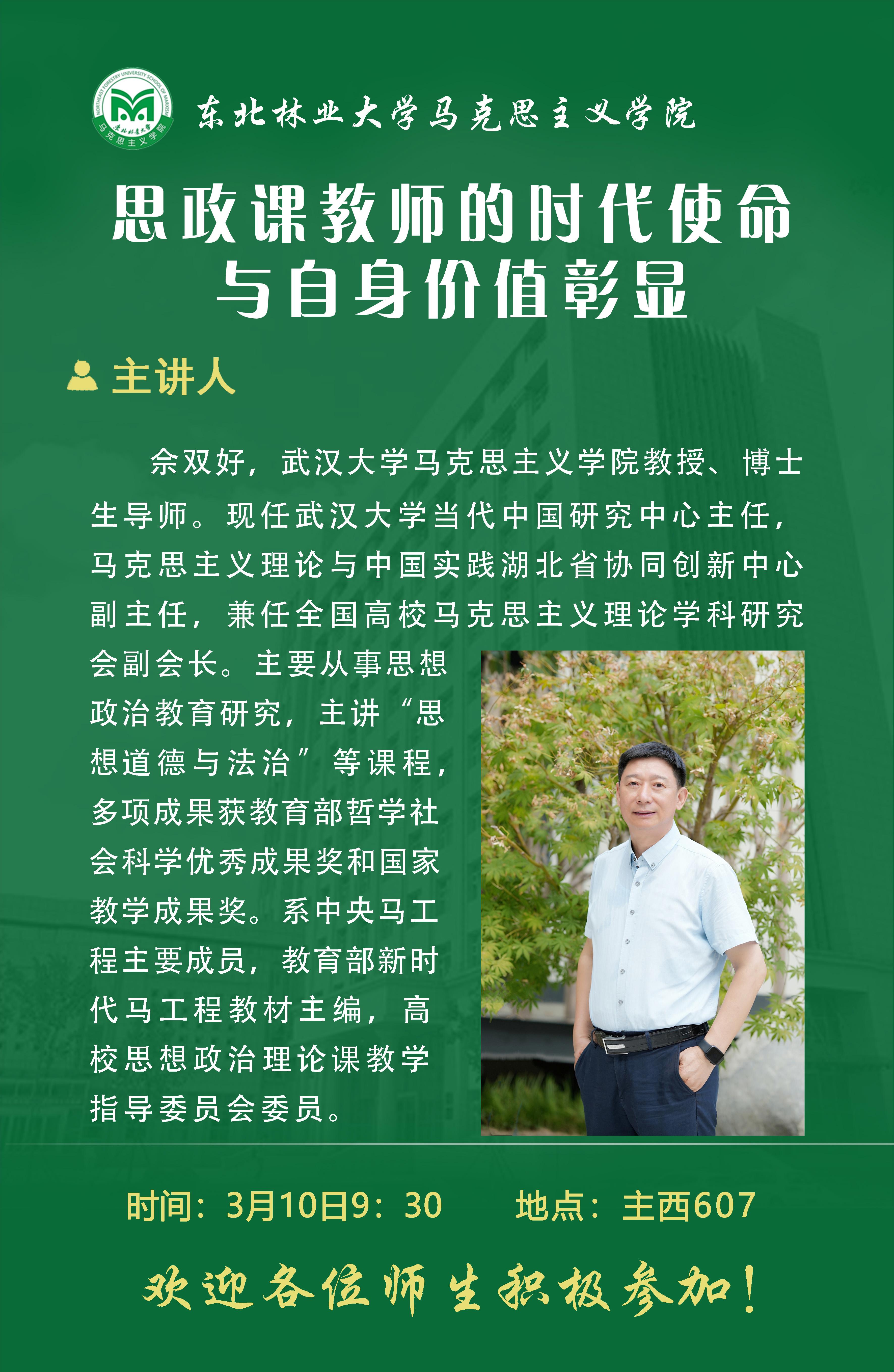 报告题目:思政课教师的时代使命与自身价值彰显报告人:佘双好教授时间:3月10日9:30地点:主西607报告人简介:佘双好,武汉大学马克思主义学院教授、博士生导师。现任武汉大学当代中国研究中心主任,马克思主义理论与中国实践湖北省协同创新中心副主任,兼任全国高校马克思主义理论学科研究会副会长。主要从事思想政治教育研究,主讲“思想道德与法治”等课程,多项成果获教育部哲学社会科学优秀成果奖和国家教学成果奖。系中...