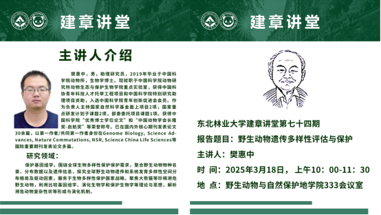报告题目:野生动物遗传多样性评估与保护主讲人:樊惠中时 间:2025年3月18日,上午10:00-11:30地 点:野生动物与自然保护地学院333会议室主讲人简介:樊惠中,男,助理研究员,2019年毕业于中国科学院动物所,生物学博士。现就职于中国科学院动物研究所动物生态与保护生物学院重点实验室,获得中国科协青年科技人才托举工程项目和中国科学院特别研究助理项目资助,入选中国科学院青年创新促进会会员。作为负责人主持国家自然...