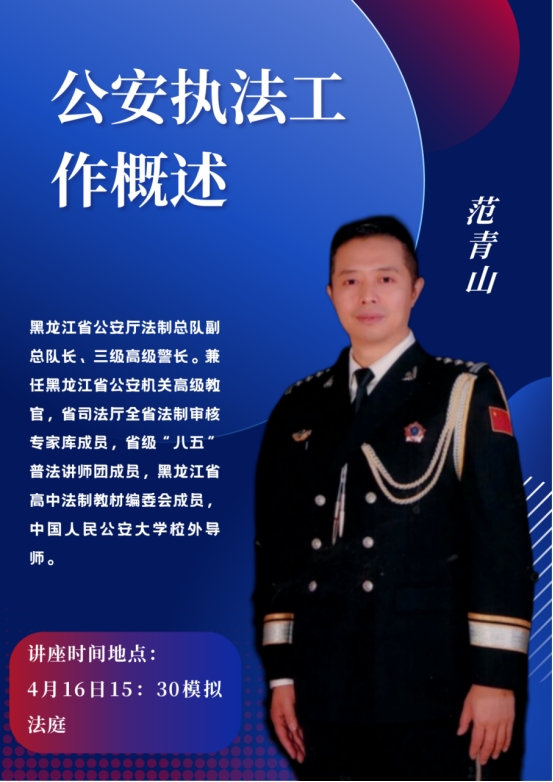 讲座名称:公安执法工作概述讲座人:范青山讲座地点:主西楼模拟法庭讲座时间:2025年4月16日15:30讲座人简介:范青山,黑龙江省公安厅法制总队副总队长、三级高级警长。兼任黑龙江省公安机关高级教官,省司法厅全省法制审核专家库成员,省级“八五”普法讲师团成员,黑龙江省高中法制教材编委会成员,中国人民公安大学校外导师。欢迎各位老师、同学参与交流