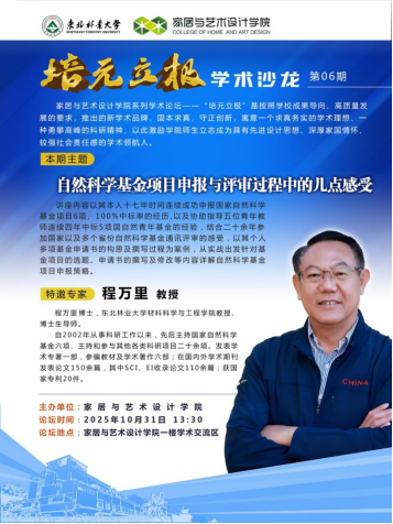 报告题目:自然科学基金项目申报与评审过程中的几点感受报告人:程万里教授主持人:牛晓霆教授报告时间:2025年10月31日13:30报告地点:家居与艺术设计学院一楼学术交流区报告人简介:程万里,东北林业大学材料科学与工程学院教授,博士生导师。自2002年从事科研工作以来,先后主持国家自然科学基金六项、主持和参与其他各类科研项目二十余项。发表学术专著一部,参编教材及学术著作六部;在国内外学术期刊发表论文150余篇,其...