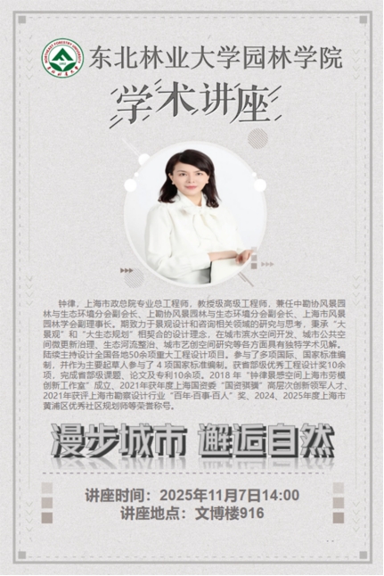讲座时间:2025年11月7日14:00讲座地点:文博楼916主办单位:园林学院讲座题目:漫步城市邂逅自然讲座人:钟律上海市政总院教授级高级工程师讲座人简介:钟律,上海市政总院专业总工程师,教授级高级工程师,兼任中勘协风景园林与生态环境分会副会长、上勘协风景园林与生态环境分会副会长、上海市风景园林学会副理事长。期致力于景观设计和咨询相关领域的研究与思考,秉承“大景观”和“大生态规划”相契合的设计理念,在城市滨...