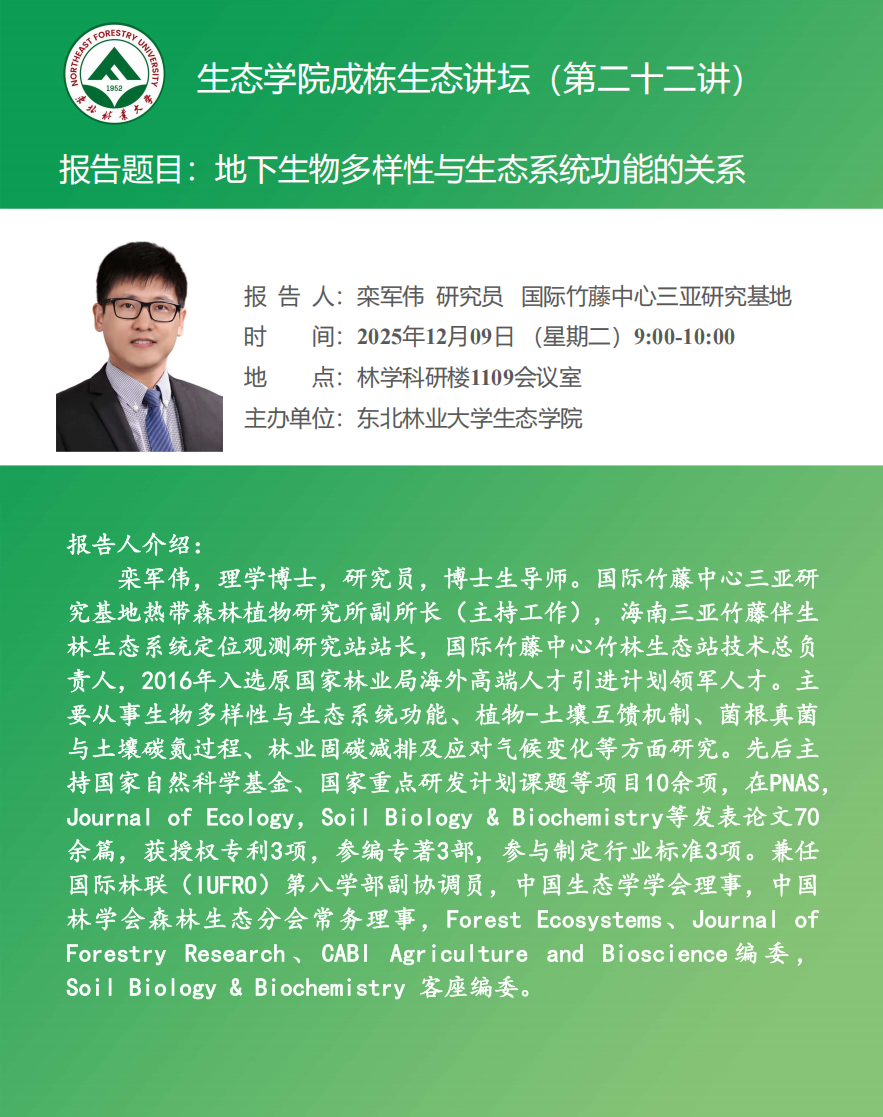报告题目:后房地产时代木业企业的创新发展与机会报告人:韩建超报告时间:2025年12月5日9:00地点:材料楼301会议室个人简介:韩建超,高级工程师,江苏福庆集团研究院院长,中国木材保护工业协会专家委员、国家林草局木材节约利用创新联盟理事会理事。东北林业大学木材科学与工程专业2005级本科生,毕业后加入福庆集团,从基层逐步晋升,在集团的研发和管理体系中发挥重要作用,推动企业在木材加工领域的技术创新与发展。主要...