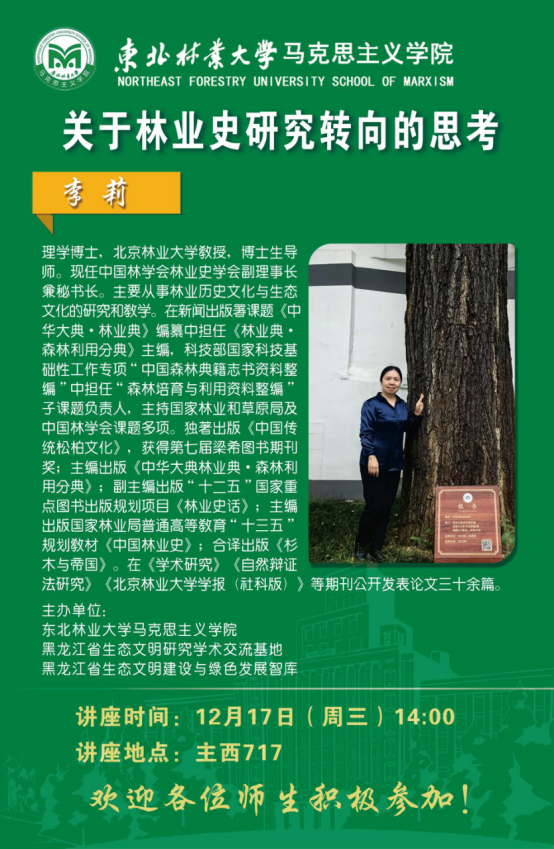 讲座题目:《关于林业史研究转向的思考》时间:12月17日(周三)14:00地点:主西717主讲人:李莉教授主讲人简介:李莉,理学博士,北京林业大学教授,博士生导师。现任中国林学会林业史学会副理事长兼秘书长。主要从事林业历史文化与生态文化的研究和教学。在新闻出版署课题《中华大典·林业典》编纂中担任《林业典·森林利用分典》主编,科技部国家科技基础性工作专项“中国森林典籍志书资料整编”中担任“森林培育与利用资料整...