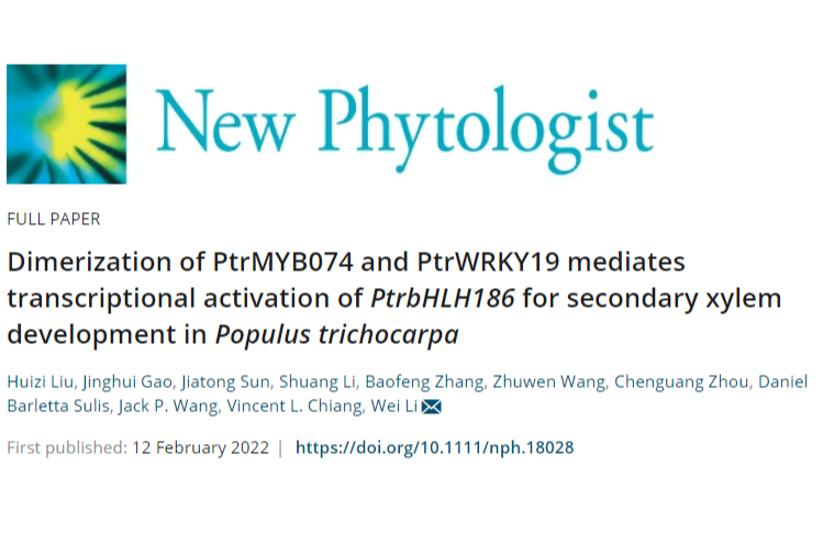 近日,林木遗传育种国家重点实验室(东北林业大学)李伟研究组在NewPhytologist(TOP期刊,IF=10.151)上在线发表了题为“DimerizationofPtrMYB074andPtrWRKY19MediatesTranscriptionalActivationofPtrbHLH186forSecondaryXylemDevelopmentinPopulustrichocarpa”的研究论文。该研究发现了调控杨树次生木质部发育的“PtrMYB074-PtrWRKY19-PtrbHLH186”分子模块,揭示了木材形成过程中转录因子(TF)TF-DNA和TF-TF相互作用的转录...