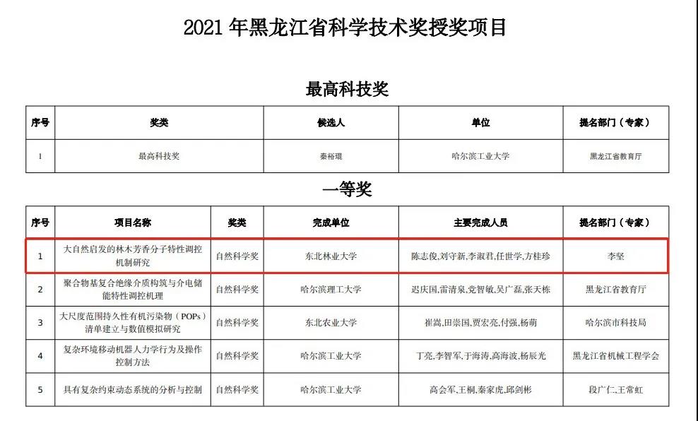 近日,黑龙江省科技厅公布了“2021年度黑龙江省科学技术奖励决定”,由中国工程院李坚院士提名,我校陈志俊、刘守新、李淑君、任世学与方桂珍,合力完成的“大自然启发的林木芳香分子特性调控机制研究”获省自然科学一等奖。林木芳香分子为含有苯环结构的天然分子,主要包括木质素与植物多酚等。作为木材细胞壁主要组分之一,木质素是地球上最丰富的芳香可再生资源。作为植物次生代谢物,植物多酚是一类具有多元酚结构的芳香生...