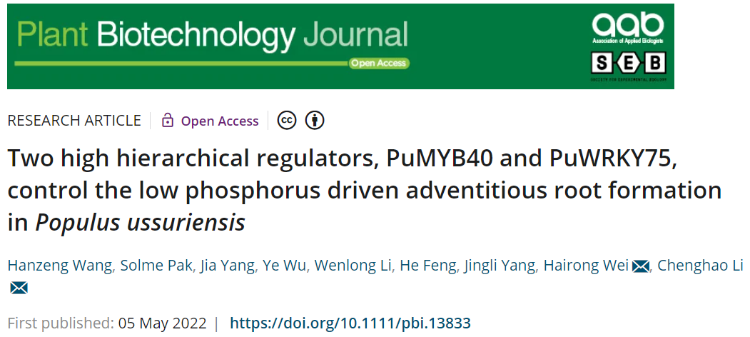 近日,我校林木遗传育种国家重点实验室李成浩研究团队在国际著名杂志PlantBiotechnologyJournal(中科院一区,IF=9.803)上在线发表了题为“Twohighhierarchicalregulators,PuMYB40andPuWRKY75,controlthelowphosphorusdrivenadventitiousrootformationinPopulusussuriensis”的研究论文,揭示了低磷信号快速诱导杨树不定根发生的调控机制。磷作为植物生长所必需的元素,对根系发育起着重要的调节作用,在水稻生长中,低磷可促...