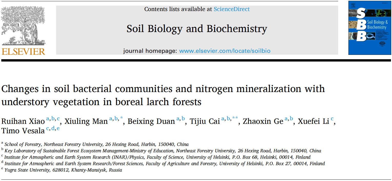 日前,我校黑龙江漠河森林生态系统国家定位观测研究站蔡体久教授科研团队在国际著名学术期刊《SoilBiologyandBiochemistry》(TOP期刊,IF=7.609)和《JournalofHydrology》(TOP期刊,IF=5.722)上相继发表了题为“Changesinsoilbacterialcommunitiesandnitrogenmineralizationwithunderstoryvegetationinboreallarchforests”和“Improvedsubsurfacesoilmoisturepredictionfromsurfacesoilmoisturethroughtheintegrationofthe(d...
