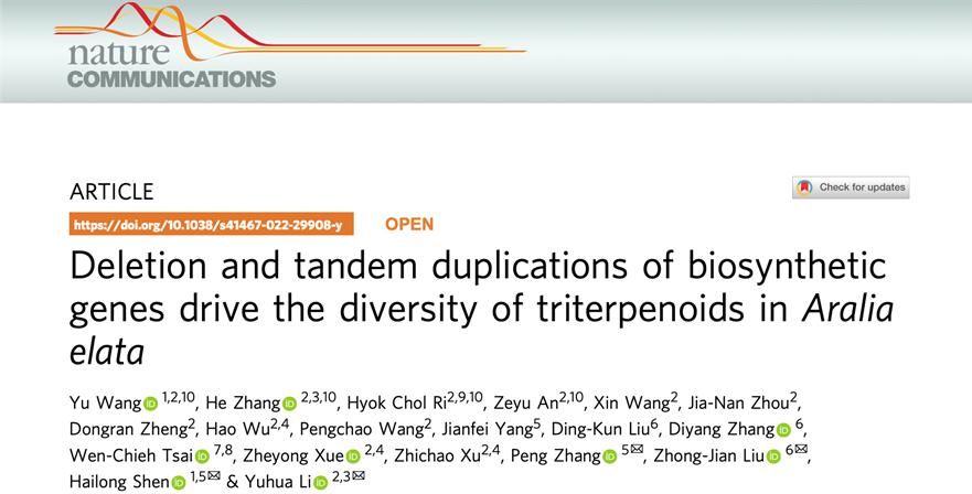 4月25日,我校生命科学学院李玉花教授团队联合林学院沈海龙教授团队在国际著名学术期刊NatureCommunications《自然通讯》上发表了题为“DeletionandtandemduplicationsofbiosyntheticgenesdrivethediversityoftriterpenoidsinAraliaelata”的研究论文。首次报道由于达玛烯二醇合酶基因的缺失及三萜骨架位点特异性修饰酶的串联重复导致五加科植物龙牙楤木中积累丰富多样的五环三萜皂苷的分子与进化机制。NatureCommunications是N...
