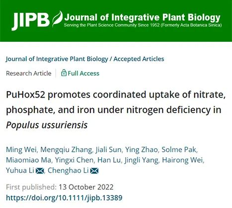 近日,我校林木遗传育种国家重点实验室李成浩教授研究团队和生命科学学院李玉花教授研究团队在JournalofIntegrativePlantBiology(中科院大类一区,IF=9.106)上联合在线发表了题为“PuHox52promotescoordinateduptakeofnitrate,phosphate,andironundernitrogendeficiencyinPopulusussuriensis”的研究论文。该研究揭示了一个新的调节机制,即PuHox52通过“PuHox52-PuNRT1.1”、“PuHox52-PuPHL1A/PuPHL1B”和“PuHox52-PuIRT1...