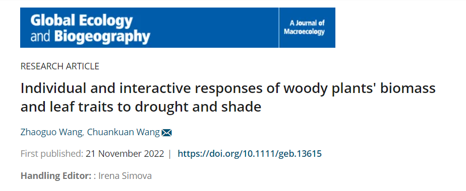 近日,我校生态研究中心王传宽教授团队的博士后王兆国,在著名生态学期刊《GlobalEcologyandBiogeography》发表了题为《木本植物生物量和叶性状对干旱和庇荫的独立作用和交互作用的响应》的论文,揭示了树木幼苗对干旱和庇荫胁迫的驯化和适应机制。近年来,全球气候变化引发干旱事件频发,进而影响到树木的生存和生长,这一系列问题备受关注。而林下植物的生长和更新,不仅面临气候变化所带来的水分胁迫,同时也受到庇荫引发的...