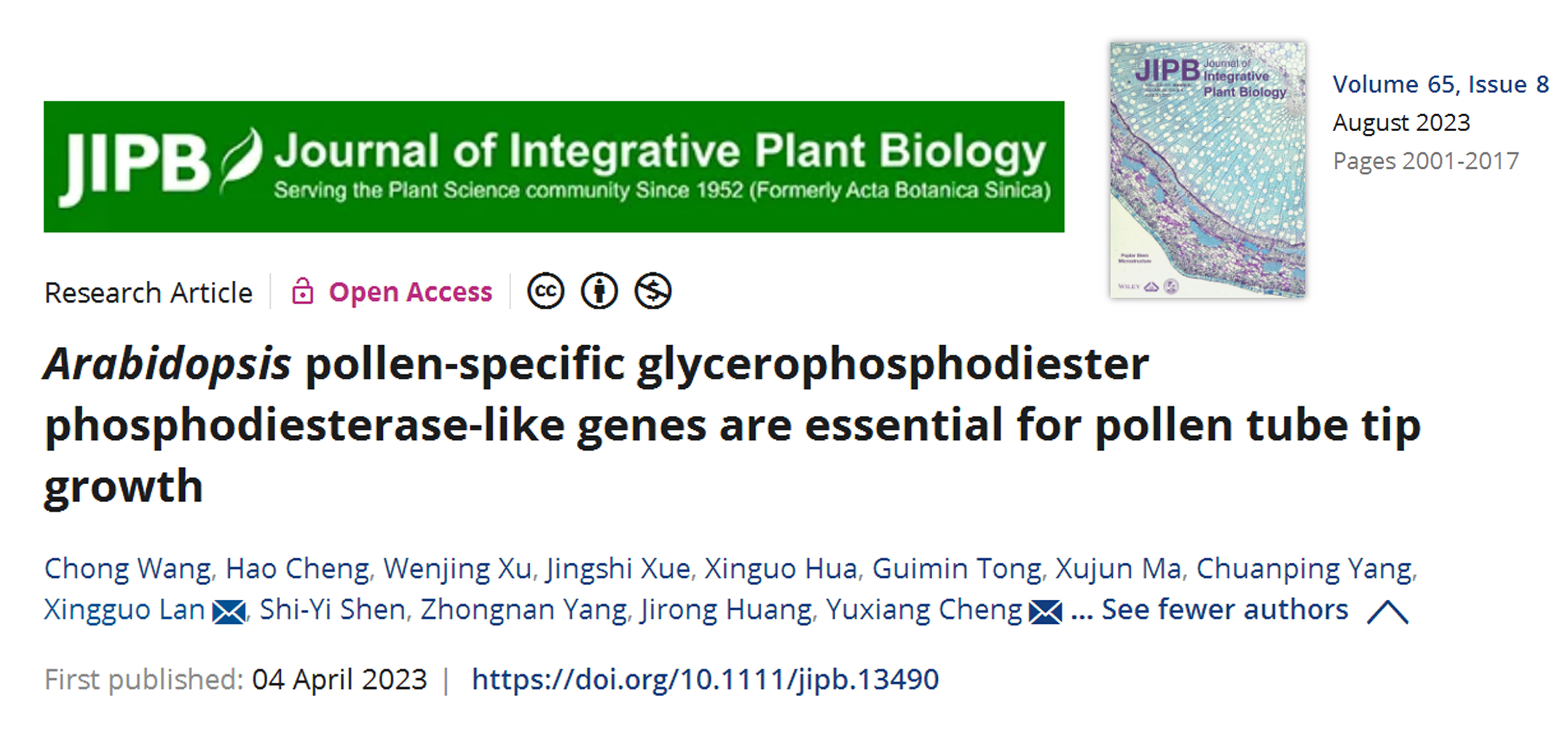近日,我校林木遗传育种全国重点实验室程玉祥团队和生命科学学院蓝兴国团队在国际著名期刊JournalofIntegrativePlantBiology上发表研究成果。该成果发现一个新的控制植物雄性育性的关键基因GDPD-LIKE,调控花粉管顶端细胞壁纤维素沉积、介入花粉管极性生长,完成开花植物受精和种子形成,为植物杂交育种培育一类新的雄性不育系奠定了基础。花粉萌发、花粉管生长对开花植物受精和种子形成至关重要。花粉管极性生长过程快速且复杂...
