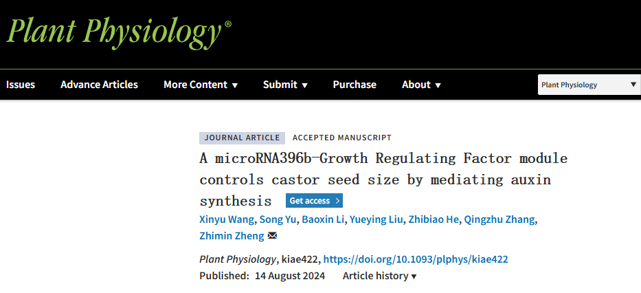 近日,林木遗传育种全国重点实验室(东北林业大学)郑志民教授团队在知名学术期刊PlantPhysiology上在线发表了题为“AmicroRNA396b-GrowthRegulatingFactormodulecontrolscastorseedsizebymediatingauxinsynthesis”的研究论文,该研究揭示了miR396b-GRF4通过影响生长素的生物合成,进而调控蓖麻种子发育的遗传调控基础。蓖麻(RicinuscommunisL.)是大戟科蓖麻属,多年生木本一年生草本植物,广泛分布于世界各地。蓖麻具有耐干...
