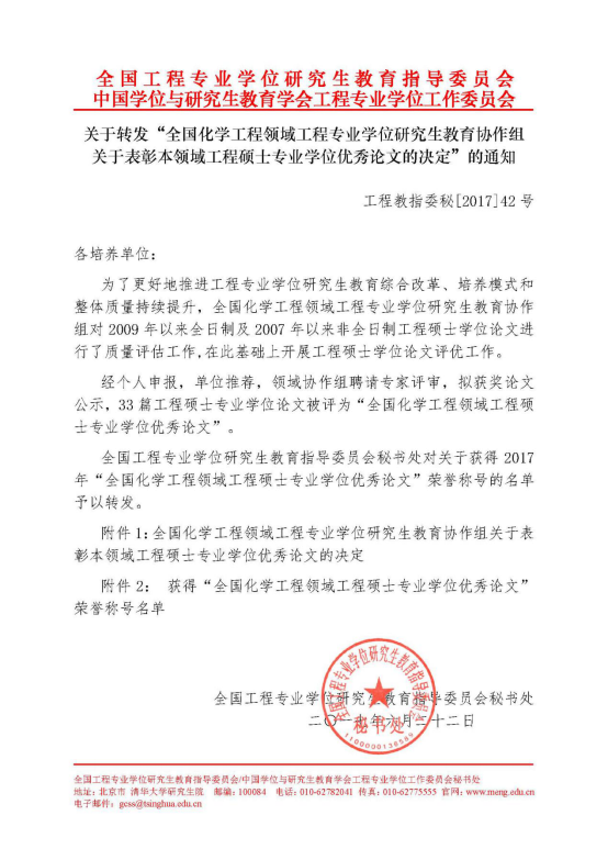 2017年“全国化学工程领域工程硕士专业学位优秀论文”名单揭晓,我校理学院陈立钢老师指导的2014届硕士研究生朴春颖同学的学位论文榜上有名。为了更好地推进工程专业学位研究生教育综合改革、培养模式和整体质量持续提升,全国化学工程领域工程专业学位研究生教育协作组对2009年以来全日制及2007年以来非全日制工程硕士学位论文进行了质量评估工作,在此基础上开展工程硕士学位论文评优工作。经个人申报,单位推荐,领域协作组聘...
