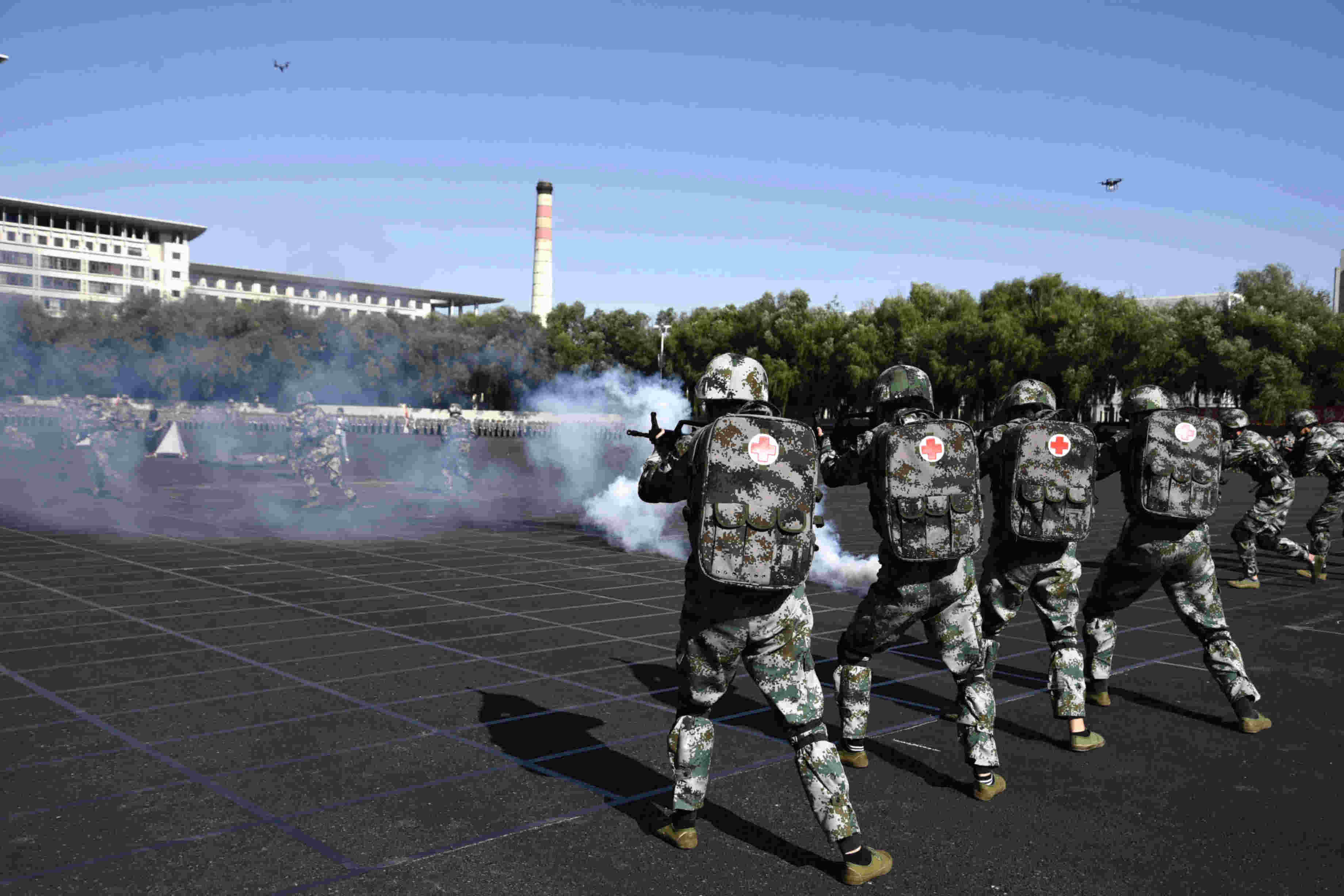 大会在雄壮的国歌声中拉开帷幕。首先进行的是三个科目的军训成果展示。第一个出场的是交通学院组成的战场医疗救护表演队,救护技术包括止血、包扎、固定、搬运等,展演同学标准、熟练和专业的动作让观众仿佛置身紧张激烈的战场环境中。紧随其后的是由外国语学院女子方队组成的捕俘刀表演,“中华儿女多奇志,不爱红装爱武装”,她们姿势标准、动作到位、紧密配合,充分展示了汗水铸就的训练成果。最后一个科目是由经济管理学院带来的擒敌拳表演展示展示,表演开始前由20人缓缓展开的30*20米的巨幅国旗在阳光下熠熠生辉,在五星红旗的映照下,342名表演者身形整齐划一,动作沉着有力,静如临渊岳峙,动似蛟龙脱兔,展现东林健儿昂扬的精神风貌和良好的军事素养。